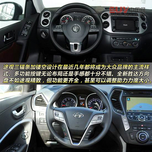 方向盤方面,2013款途觀維持了以往的造型,三輻條加鏤空設計,在最近幾年都將成為大眾品牌的主流樣式。多功能區域集中在方向盤兩邊,無論是按鍵布局還是手感,都十分不錯。雖然我們找不出途觀方向盤設計方面太多新穎感受,但無論樣式還是手感,都十分令人滿意。