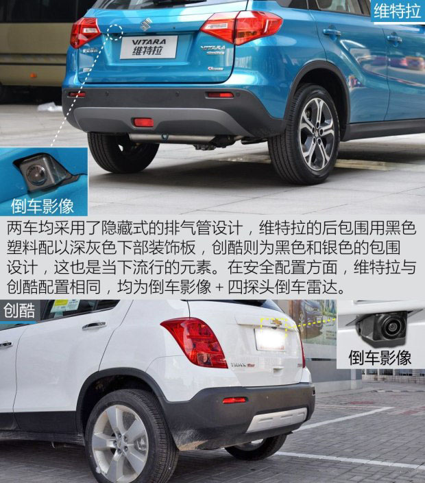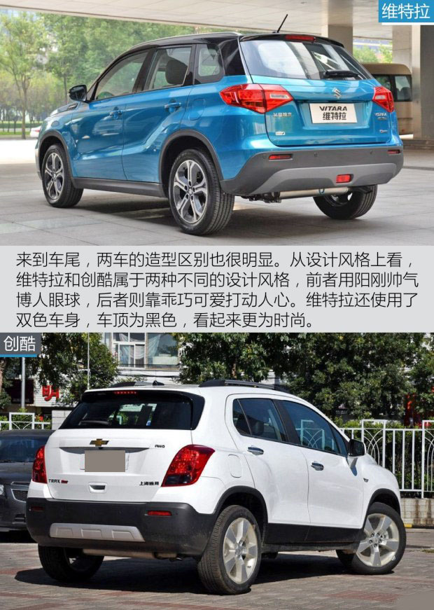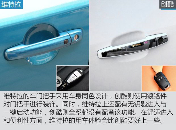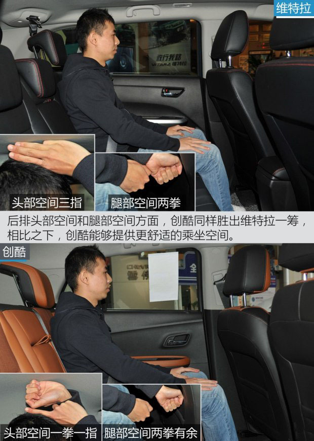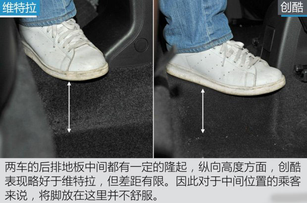 原因:在乘坐空間方面,創酷的前后排乘坐空間比維特拉好,乘坐起來更舒適。不過軸距比創酷短55mm的維特拉前后排也有尚佳的前后排乘坐表現,而且它還在后備廂空間環節完勝了創酷。因此這個環節維特拉和創酷戰成平手:需要乘坐空間更大——選創酷;需要后備廂空間更多——選維特拉。