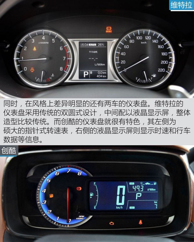儀表盤也是一樣,在維特拉的儀表盤上兩塊實體表盤分列兩側,中央為一塊行車電腦的液晶顯示屏,看起來較為傳統。創酷則采用了一塊巨大的液晶屏取代左側傳統的時速表盤,看起來更為時尚,也更有科技感。