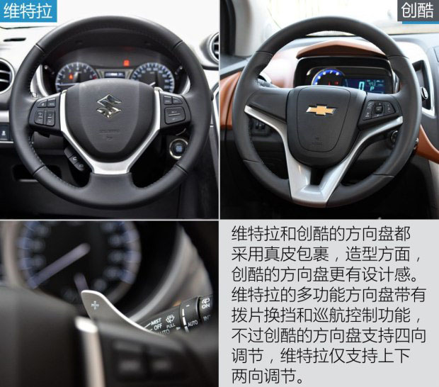維特拉配備有撥片換擋功能,而且相比創酷,通過它的多功能方向盤還能控制更多的車載系統,如創酷不具備的定速巡航以及CarPlay功能。再看創酷,它的方向盤為四向調節,能夠適應不同體型的駕駛者,配置更為人性化。