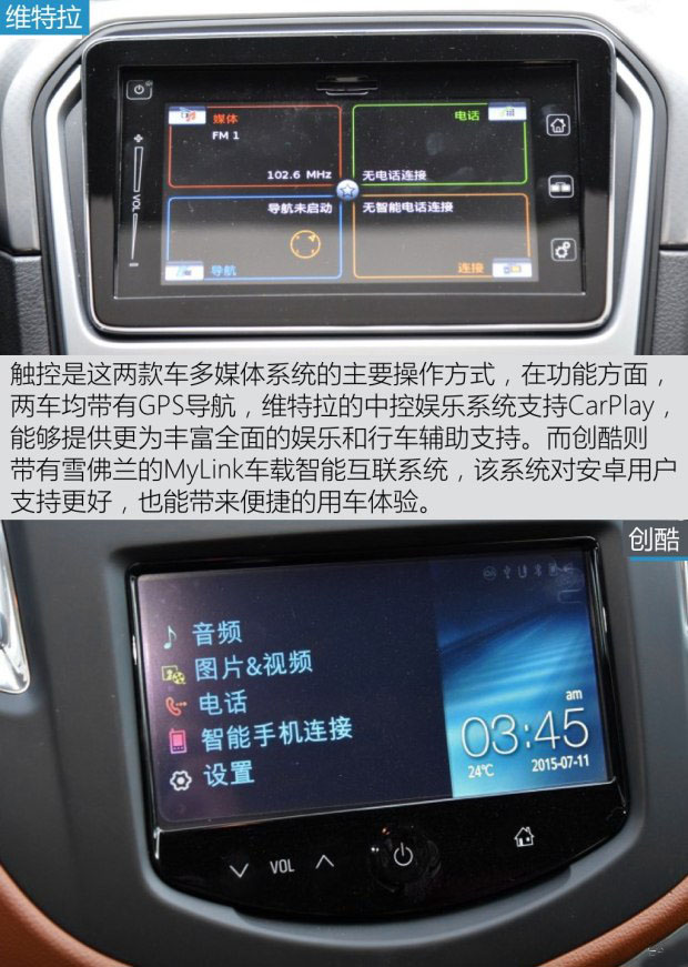 這兩款車都配有帶觸控功能的中控顯示屏,并帶有GPS導航功能,屏幕上的操作便利程度不相上下。不過維特拉配備了這一級別車型中不多見的CarPlay功能,通過它能夠提供更加豐富便利的娛樂和行車輔助功能。雪佛蘭的MyLink車載智能互聯系統在創酷上也有所配備,這套系統對安卓用戶的支持程度更高,而且創酷還帶有安吉星功能。對于使用蘋果手機的用戶,顯然維特拉帶有的CarPlay更好用,不過創酷上的MyLink+安吉星系統則可以照顧到更多的安卓用戶,因此總體而言創酷的車載娛樂系統使用的便利性也不會差上多少。