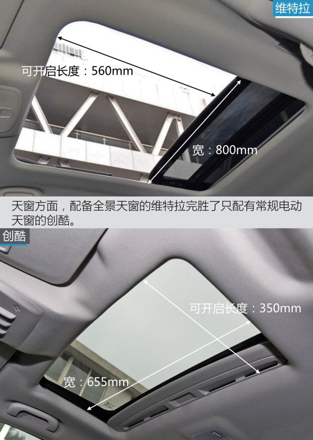 天窗的情況也是如此,維特拉配備了尺寸巨大的全景天窗,而創酷配備的則是常規的電動天窗。