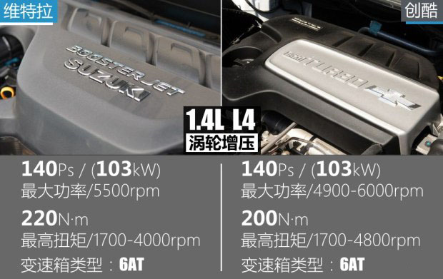 動力方面,維特拉與創酷配備的都是1.4T發動機,最大功率同為140Ps,扭矩方面維特拉比創酷高出20N·m達到220N·m,與發動機相匹配的變速箱兩車同為6擋手自一體變速箱。