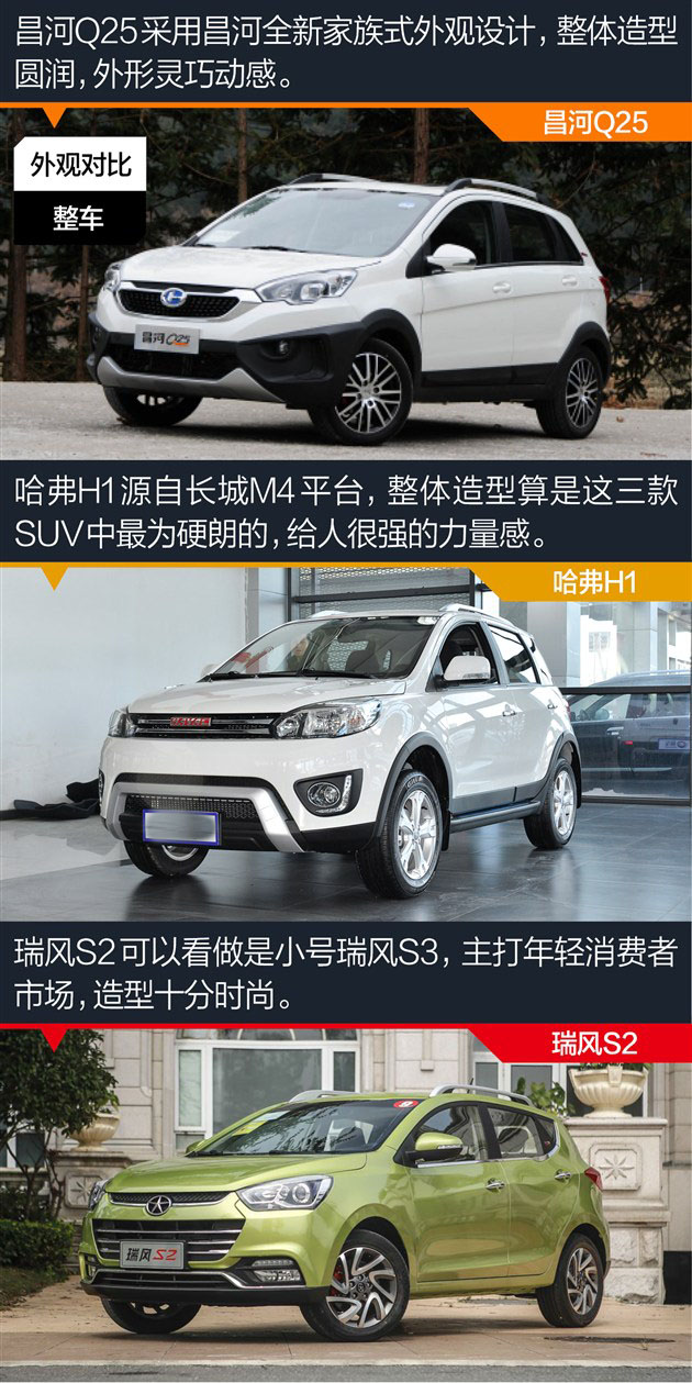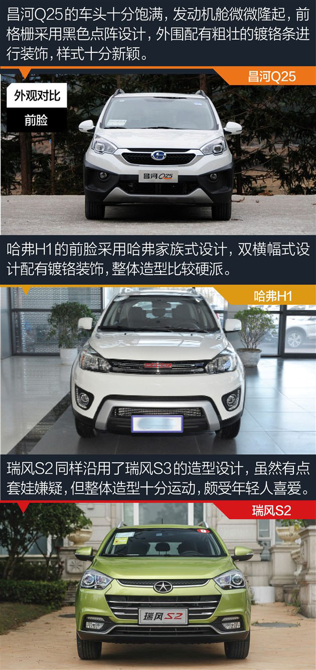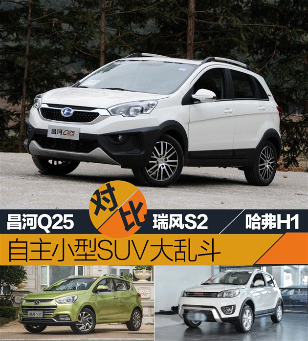 【SUV中國網】近兩年國內各大自主品牌不斷推出新車型來搶占火爆的SUV市場,在小型SUV圈內已經形成大亂斗之勢。這不,昌河汽車也坐不住了,在3月底推出了旗下首款小型SUV——昌河Q25。新車的售價區間為5.59萬-7.59萬元,與目前市場上熱銷的哈弗H1、瑞風S2價格十分接近,明顯可以看出Q25就是沖著前輩哈弗H1和瑞風S2而來的。那么今天我們就來拿三車比一比,看看昌河Q25有沒有挑戰前輩的實力。