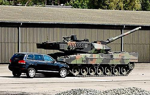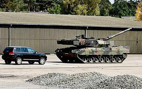 被碾壓的是大眾途銳,這是一直都享有盛名,大眾的SUV更是沒得說。不過不知它能不能承受德國豹2主戰坦克的碾壓呢。