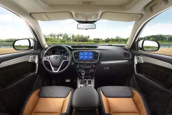 儀表盤采用雙圓設計,轉速表和車速表使用液晶顯示,字體也是吉利家族式字體,行車電腦可顯示胎壓、油耗等信息。中控屏采用高清9寸觸摸液晶大屏,分辨率達到1024*600,支持1080P的高清視頻,觸控式電容按鍵響應時間為25毫秒。除導航外,還有藍牙電話等功能,還可將手機屏幕映射到中控屏上。