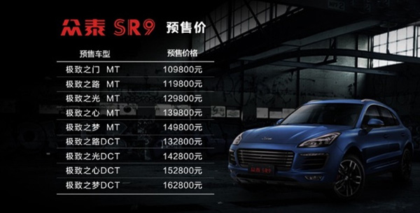 【SUV中國網】近日,眾泰S系列官方正式宣布,眾泰SR9將于今晚19時19分正式開啟預售,預售價為10.98-16.28萬元,新車共計推出9款車型,詳細預售價信息見下表: