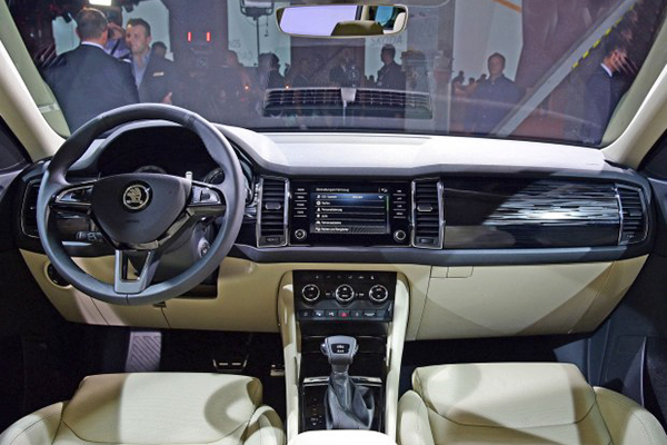 相比起較為時尚、硬朗的外觀,斯柯達柯迪亞克的內飾則顯得更加的商務和家用一些,整體造型中規中矩。中控臺采用了大面積的搪塑材質進行包裹,較大尺寸的木紋飾板的引用,看著較為豪華,整體很有質感。