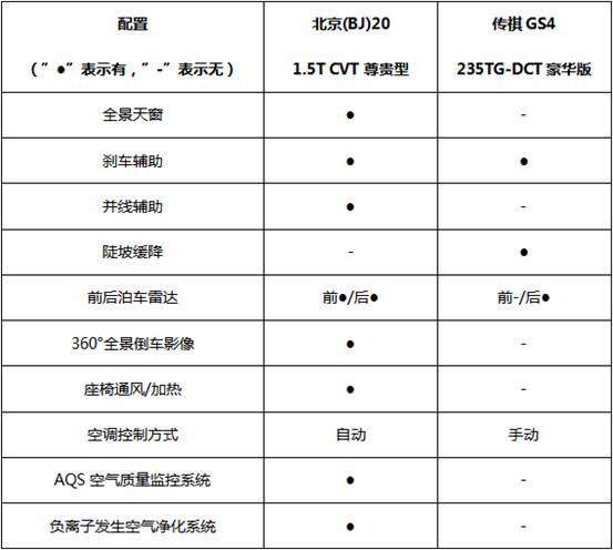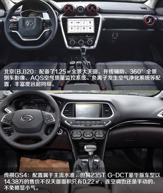 要想吸引年輕消費者,車型的配置也不能少。為了方便比較,本次選擇了BJ20 1.5T CVT尊貴型和GS4 235TG-DCT豪華版這兩款排量相同、價格相近的車型進行對比。