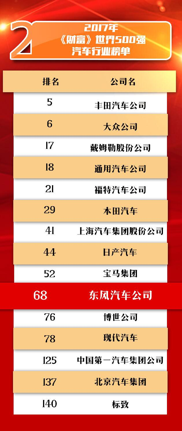 7月20日,2017年最新《財富》世界500強排行榜出爐。東風汽車公司以861.93億美元的營業收入再次躋身《財富》世界500強前100名,位居68位,較上年的81位上升了13位,位居中國上榜企業第16位,全球汽車企業排名第十。至此,東風汽車公司已連續8年躋身《財富》世界500強榜單。
