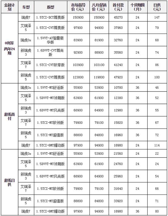 超低首付:瑞虎7首付低至18980元起;艾瑞澤5首付低至12380元起;瑞虎3x首付低至10780元起;新瑞虎3首付低至12980元起。