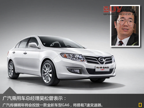 廣汽傳祺在2013年上半年共計銷售新車3.4萬輛,已超過去年的銷量總和,與此同時更多新產(chǎn)品的投放以及新技術的研發(fā)也已有相應的規(guī)劃,廣汽乘用車總經(jīng)理吳松曾表示:“廣汽傳祺明年將會投放一款全新車型GA6,將搭載7速變速器。”網(wǎng)通社從廣汽傳祺官方了解到:GA6車型定位于B級跨界車型,與之匹配的將是7速雙離合變速箱。