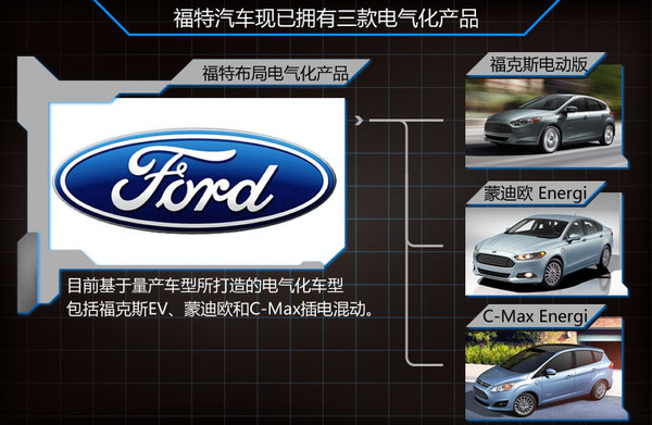 在電氣化車型的發展規劃上,福特汽車亞太區總裁蕭達偉曾表示:“福特整個電氣化戰略要在量產車平臺上實現,只要消費者展現出對電氣化產品的需求,我們就將把產品帶到市場上來。”目前基于量產車型所打造的電氣化車型包括福克斯電動版、蒙迪歐插和C-Max插電混動版共計三款車型。蕭達偉還表示:未來福特將更加關注于電動汽車和插電式混合動力車型。