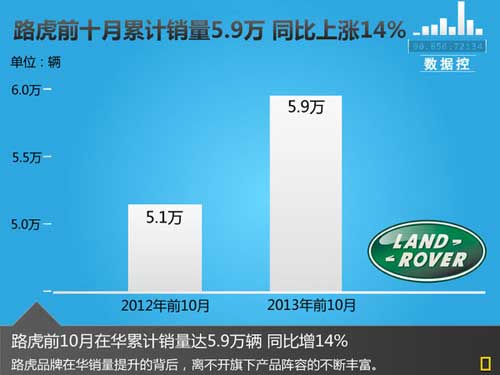 SUV市場的持續升溫和消費者對于豪華品牌認知度的不斷提高,使得豪華SUV市場更是備受關注。路虎品牌便依托旗下攬勝、神行者2以及極光在市場中的強勁表現,連續三年保持高增長態勢。其中2010年路虎在華銷售23,459臺,同比增長近100%;2011年共銷售36,087臺,同比增長54%; 去年銷量更是達到了65,896臺,同比增長83%,其中2013年前10個月銷量已占據2012全年近90%的份額。