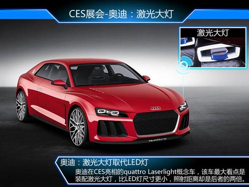 在本屆CES展會(huì)上,奧迪發(fā)布了一款全新的概念車名為quattro Laserlight。這款新車最大的亮點(diǎn)莫過(guò)于采用了全新的激光大燈技術(shù),由內(nèi)、外兩組梯形燈組元素組成的,外側(cè)是由矩陣式LED燈源構(gòu)成的近光燈,內(nèi)側(cè)是由激光技術(shù)打造的遠(yuǎn)光燈。采用激光技術(shù)的遠(yuǎn)光燈其亮度是普通LED燈源的3倍,照明距離可達(dá)500米。