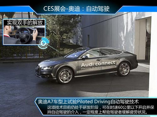 除發(fā)布了全新概念車外,奧迪還在展示了最新研發(fā)的Piloted Driving自動(dòng)駕駛技術(shù),并將這一技術(shù)應(yīng)用于奧迪A7的試驗(yàn)車。據(jù)奧迪官方表示,該技術(shù)目前尚處于研發(fā)階段依然有待完善。此次CES的自動(dòng)駕駛試驗(yàn)車將通過(guò)車輛安裝于各處的攝像頭和紅外線測(cè)距,分別負(fù)責(zé)檢測(cè)行駛路線、車道分界線。車尾感應(yīng)雷達(dá)則負(fù)責(zé)探測(cè)后方車輛的距離。通過(guò)這一自動(dòng)駕駛技術(shù),可是車輛在60公里時(shí)速以下,一定程度上可以幫助駕駛者緩解駕駛疲勞。同時(shí)在A7的后備廂還裝備有一臺(tái)電腦進(jìn)行數(shù)據(jù)分析,從而精準(zhǔn)的掌控油門、剎車以及轉(zhuǎn)向的力度。