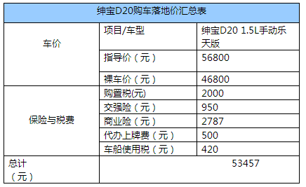 紳寶D20產品力好、性價比高,經得起考驗,“金九銀十”、購置稅減半、節(jié)能補貼等一連串的優(yōu)惠活動力度很大,這個時候開回家中絕對是明智之舉。夏洛特煩惱,老王不煩惱,買紳寶D20,就這么愉快的決定了!紳寶D20一直采取優(yōu)惠一萬元的政策,這最近又趕上了國慶前后各大4S店的促銷活動,又是優(yōu)惠價格又是送保養(yǎng),這樣算下來肯定會更省錢。以1.5L手動樂天版為例,老王完全可以以4.68萬元裸車價拍板拿下。而且,前不久國務院決定,對購買1.6升及以下排量乘用車實施減半征收車輛購置稅的優(yōu)惠政策,紳寶D20可是妥妥的在內,所以本來該交4000元的購置稅只付2000元就可以了!此外再加上950元的交強險,2787元的商業(yè)險,500元的代辦上牌費,420元的車船使用稅,總共算下來只要53457元,老王完全可以負擔得起啊!