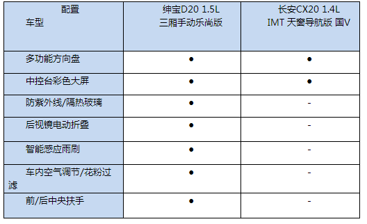 (紳寶D20三廂1.5L手動樂尚版與長安CX201.4L天窗導航版 國V 配置對比表)