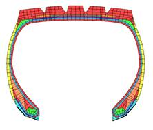 本文以295/80R22.5全鋼子午線輪胎為研究對象,其主要結(jié)構(gòu)由橡膠和簾線-橡膠復(fù)合材料構(gòu)成。輪胎各部分材料數(shù)據(jù)均通過單軸拉伸試驗(yàn)測試所得[7]。圖1為輪胎有限元模型。三維縱溝輪胎模型由二維軸對稱輪胎截面通過Abaqus中的SYMMETRIC MODEL GENERATION命令旋轉(zhuǎn)為3D輪胎模型。首先,控制與輪輞接地部位的胎圈節(jié)點(diǎn)六個(gè)方向自由度,采用RAX2單元模擬輪輞,約束輪胎充氣時(shí)胎圈部位不發(fā)生任何移動(dòng),對其施加標(biāo)準(zhǔn)充氣壓力。然后,利用圓周方向非均勻離散生成120份3D模型,其中,為了兼顧精度和計(jì)算效率,在接地區(qū)60°中包含細(xì)化網(wǎng)格60份。此外,以平面解析剛體來模擬路面。對輪胎載荷的施加,分為兩步,首先,利用移動(dòng)路面位移邊界條件來實(shí)現(xiàn)輪胎與路面之間的接地,然后,利用輪胎負(fù)荷取代位移邊界條件。在建立輪胎模型時(shí),橡膠材料本構(gòu)模型選用超彈性Yeoh模型來描述它的力學(xué)特性,鋼絲簾線-橡膠復(fù)合材料利用Rebar單元模擬。該輪胎的標(biāo)準(zhǔn)載荷為35500N,充氣壓力位0.9MPa.