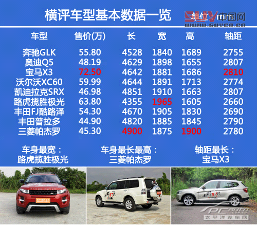 本期越野時代是不折不扣的大制作,我們一共聚齊了9臺50萬級別的豪華SUV,據(jù)說可以召喚出神龍了。9臺車在尺寸上也不不盡相同,首先德系三強中,奔馳GLK體量最小,奧迪Q5和寶馬X3則稍大;沃爾沃XC60、凱迪拉克SRX、豐田FJ則屬于中間水平;最大體格還要屬豐田普拉多和三菱帕杰羅哥倆。其中路虎攬勝極光三門版有著最短的軸距和最寬的車身,帕杰羅不僅車身最長還最高,而軸距最長的車型居然是寶馬X3,有些令人意外。