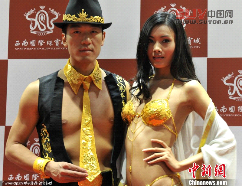 2009年6月26日,重慶南坪國際會展中心,一對模特身著價值400萬用純金打造的黃金內衣、領帶、腕帶正在走秀。