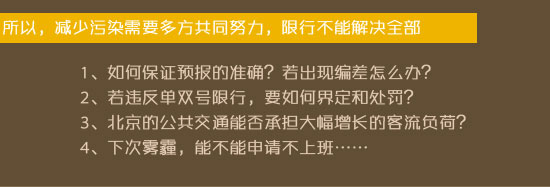 因此,此次極端天氣下的單雙號限行的應急預案再度引發疑問。如此大規模地限行,對于治理空氣污染的效果到底有多大?北京市擁有數百萬私家車主,涉及如此廣泛人群的公共政策,是否應聽取公眾意見?很多人住在城外,開車上下班,遇上單雙號限行,他們的交通問題怎么解決?