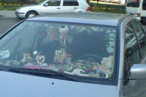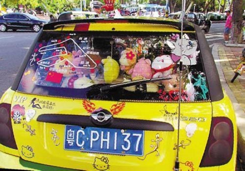 小陸剛買了一輛新車,為了讓車子更美觀,小陸的女友花了一個下午的時間給車子裝飾了一番。車前擋風玻璃下面放著不停晃動的嘻哈猴,音響按鍵上貼滿了水晶粘紙,后擋風玻璃下面擺放各種小玩偶。