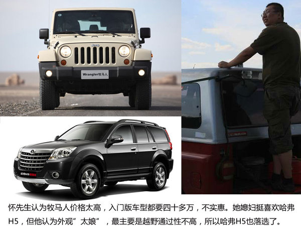 jeep價格太高,入門版車型都要四十多萬,不是太實惠,所以第一個被否決。懷先生說她媳婦挺喜歡哈弗H5,但他認為外觀“太娘”,不夠霸氣,而且越野通過性不高。懷先生自駕游的地方路況都比較差,對車輛性能和通過性要求十分高,之后這輛車也被他否決了。前陣子得知北京40上市,懷先生說他終于可以換車了。