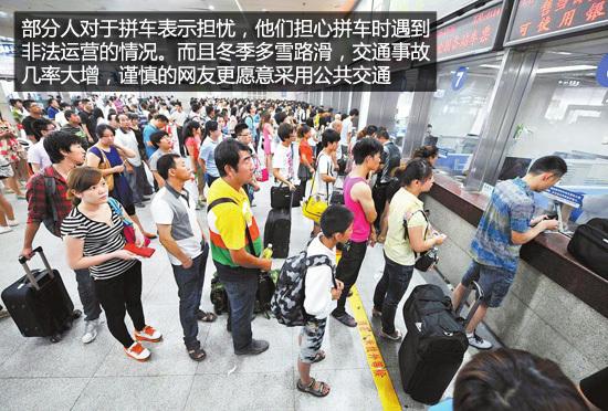 在所有調(diào)查者中,有接近40%的網(wǎng)友對(duì)于拼車表示擔(dān)憂。他們擔(dān)心拼車時(shí)遇到非法運(yùn)營(yíng)的情況,從而無(wú)法保障自身合法權(quán)益。另外,由于冬季多雪路滑,再加上回家車輛較多,路上難免出現(xiàn)大大小小的交通事故。所以謹(jǐn)慎的網(wǎng)友認(rèn)為公共交通更加靠譜,他們寧愿加價(jià)買車票,或是推遲回家時(shí)間,也不愿意承擔(dān)拼出帶來(lái)的風(fēng)險(xiǎn)。