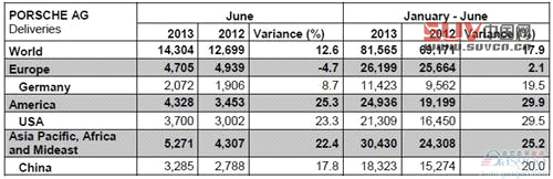 2013年6月份,保時捷在全球范圍內交付了14,304輛汽車,在2012年12,699輛的基礎上,同比增長12.6%。上半年,保時捷全球累計銷量為81,565輛,去年同期69,171輛,今年同比提高了17.9%。