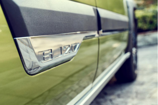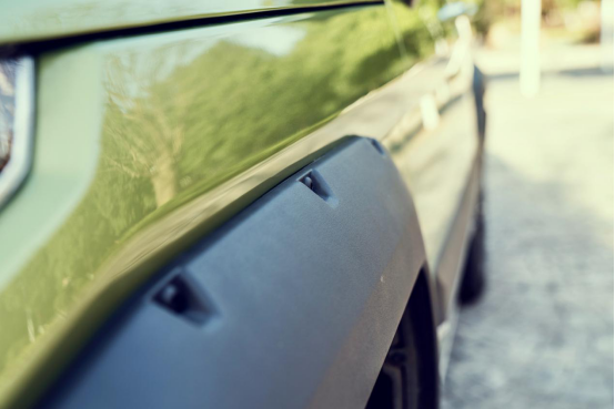 黑色塑料材質(zhì)的輪眉被螺栓固定在車身上,前后保險杠和車身防擦條也采用了同樣的材質(zhì)。區(qū)別于車身涂裝的配色令這款BJ20的外觀具備了豐富的視覺元素。造型方面的搭配也為車身增加了機械美感。