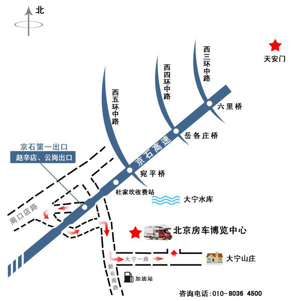 1.京港澳高速(石家莊)方向--13出口(云崗)---80米橋下掉頭--80米右轉—300米紅綠燈左轉—150米左側—北京房車博覽中心 GPS定位可以設定:北京市房山區大寧高爾夫或者大寧山莊