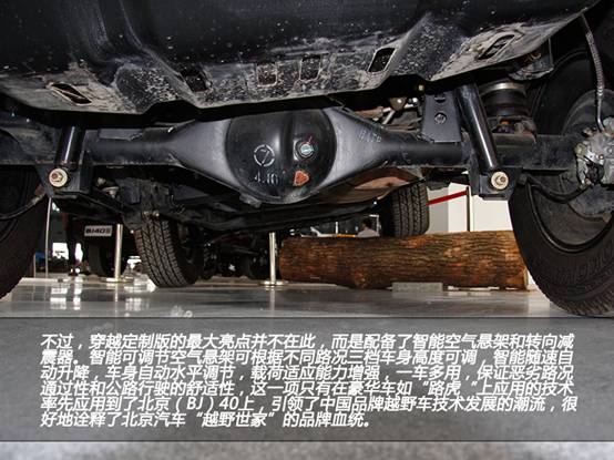 當然,北京(BJ)40穿越定制版最大亮點當然還要屬可變的智能空氣懸掛系統,這也是打造全能的必備裝備。一方面,在城市中降低車身高度有助于行駛中的車身穩定,而在特定環境下,底盤升高之后,北京(BJ)40穿越定制版又瞬間化身成越野利器。關鍵是此等裝置一般只會出現在大切或者G級之上,而且價格更要翻數倍。
