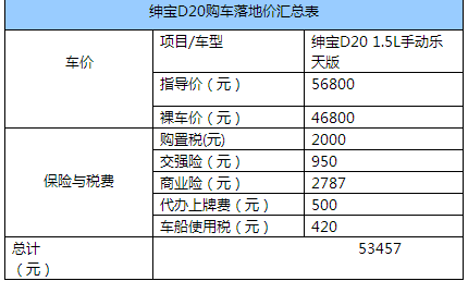 紳寶D20一直采取優惠一萬元的政策,這最近又趕上了國慶前后各大4S店的促銷活動,又是優惠價格又是送保養,這樣算下來肯定會更省錢。以1.5L手動樂天版為例,老王完全可以以4.68萬元裸車價拍板拿下。而且,前不久國務院決定,對購買1.6升及以下排量乘用車實施減半征收車輛購置稅的優惠政策,紳寶D20可是妥妥的在內,所以本來該交4000元的購置稅只付2000元就可以了!此外再加上950元的交強險,2787元的商業險,500元的代辦上牌費,420元的車船使用稅,總共算下來只要53457元,老王完全可以負擔得起啊!