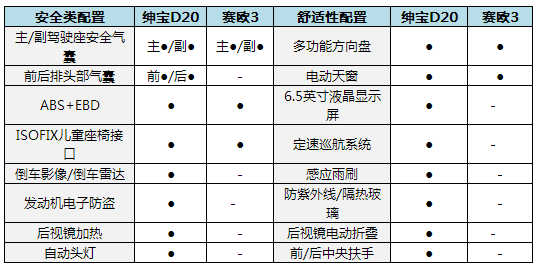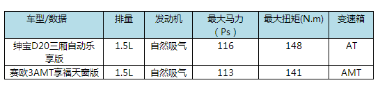(紳寶D20三廂1.5L自動樂享版與賽歐3 1.5L AMT幸福天窗版配置對比表)